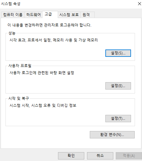 win + pausebreak 키를 누른 뒤, 우측의 고급 시스템 설정을 눌러 시스템 환경 변수 편집 해준다.