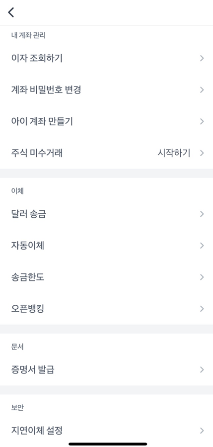이후 토스뱅크에서, 토스증권 계좌 상세 페이지에서, 설정을 확인해보면 이체 메뉴에 달러 송금 버튼을 확인 할 수 있다.