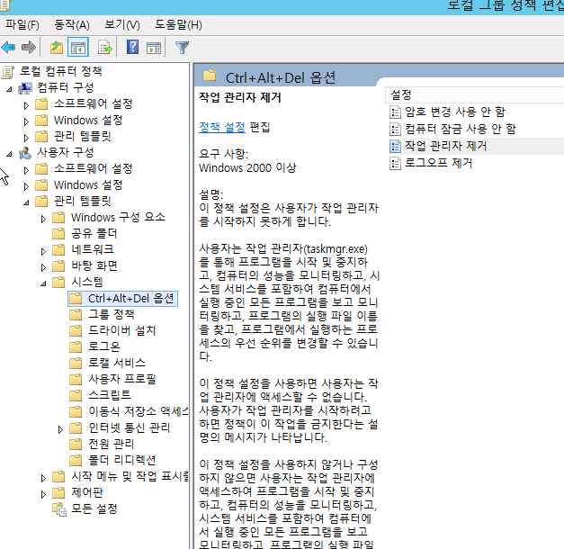 2. 사용자 구성 > 관리 템플릿 > 시스템 > Ctrl Alt Del 옵션 에서 작업 관리자 제거 조회
