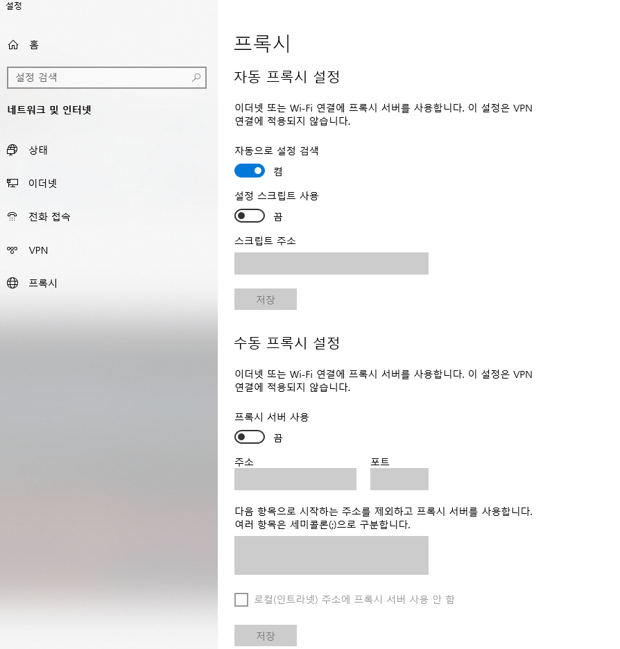 컴퓨터에서 프록시 - 수동 프록시 설정에서 프록시 서버 사용 설정을 한 뒤, 주소와 포트를 설정해준다.