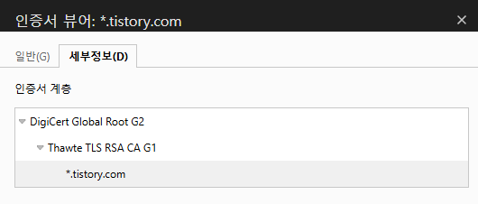맨 위의 DigiCert Global Root G2가 ROOT인증서, Thawte TLS RSA CA G1이 중간 인증서, *.tistory.com 이 SSL 인증서이다.