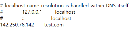 hosts 파일에 142.250.76.142 (탭) test.com 을 입력 후 저장.