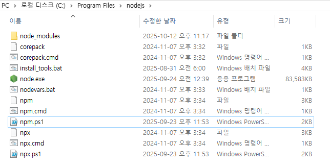 해당 경우 경로의 npm.ps1 파일을 제거하여 해결 가능하다.
